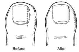 After applying a local anesthetic, the doctor removes part of the nail’s side border. Some nails may become ingrown again, requiring removal of the nail root.